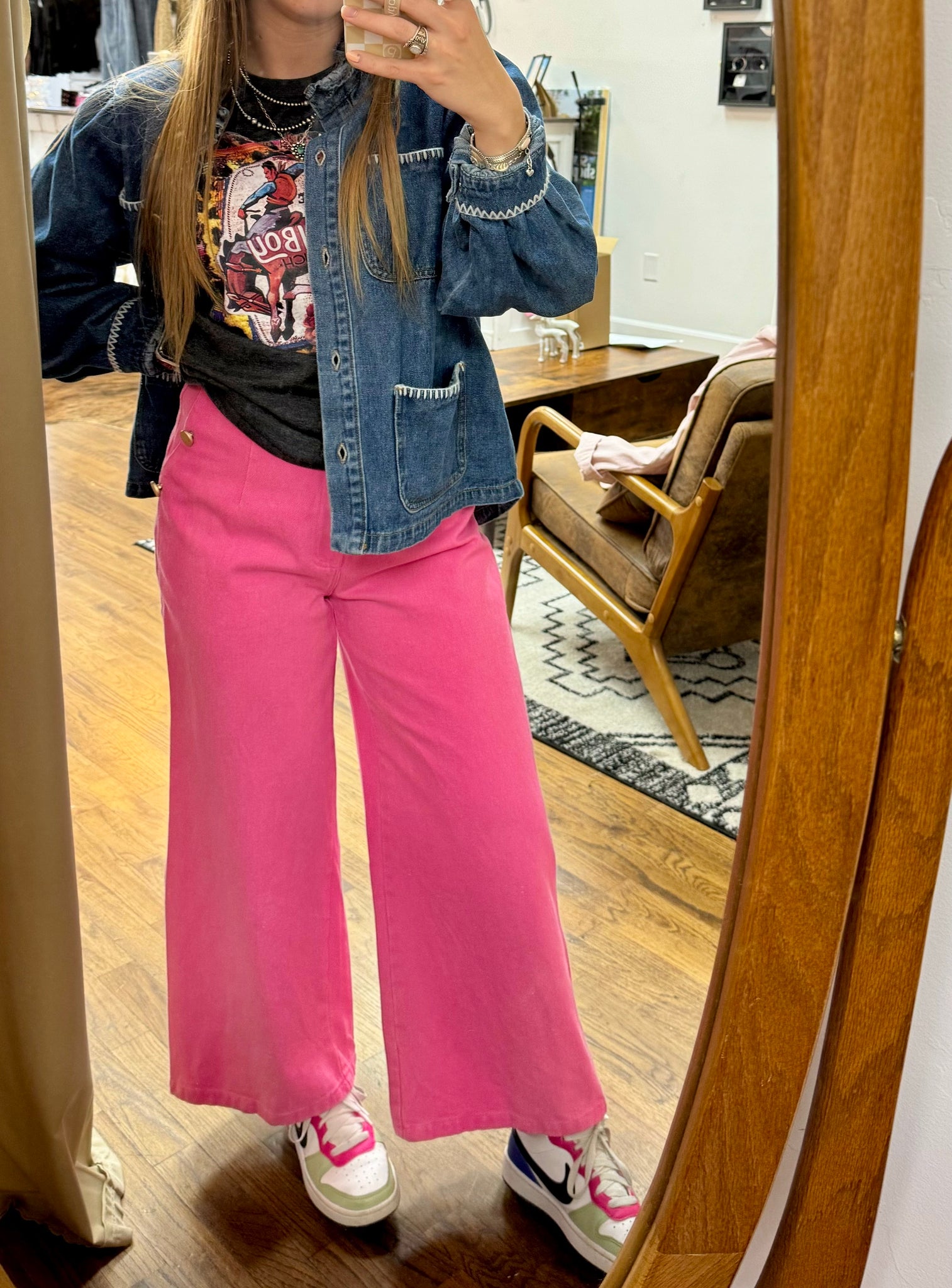 The Hot Pink Pant has been a fan favorite in every color! The gold button detailing, midi rise, and wide leg are unique and flattering on!