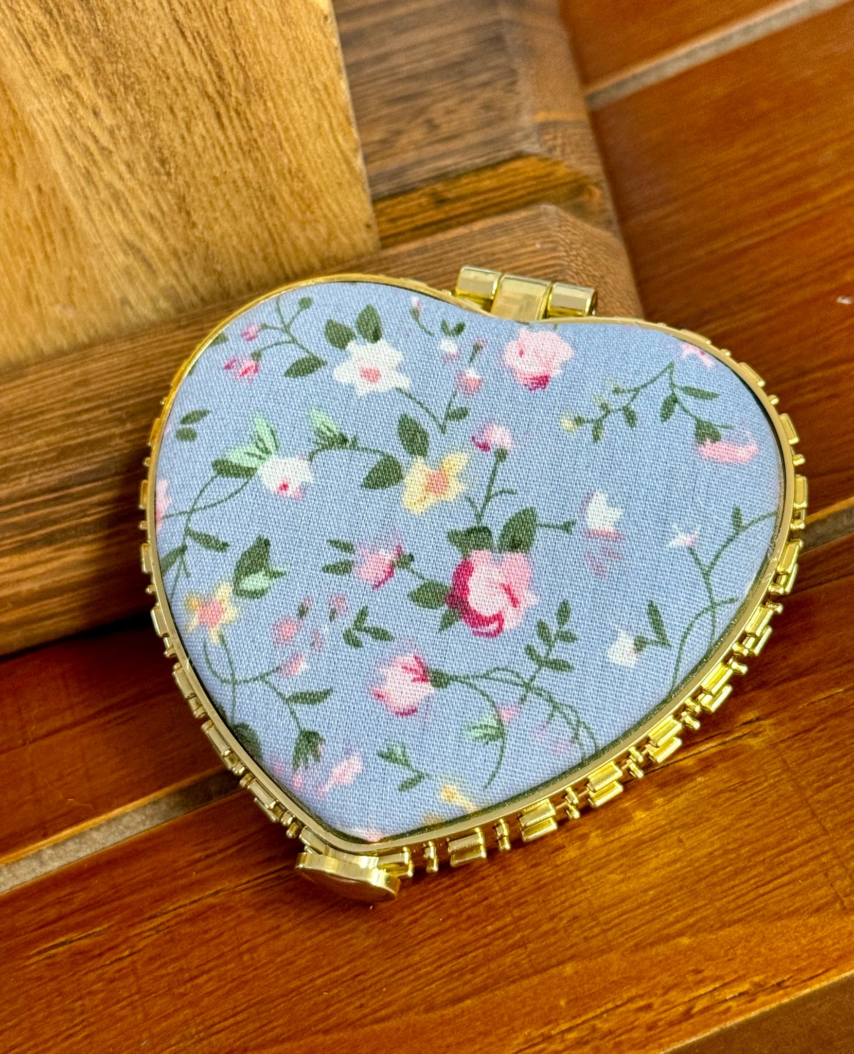 The heart pocket mirror is an everyday item that you're sure to get use out of! The timeless fabric print on the front, and the intricate gold detailing are sure to get you compliments each time you pull this item out!