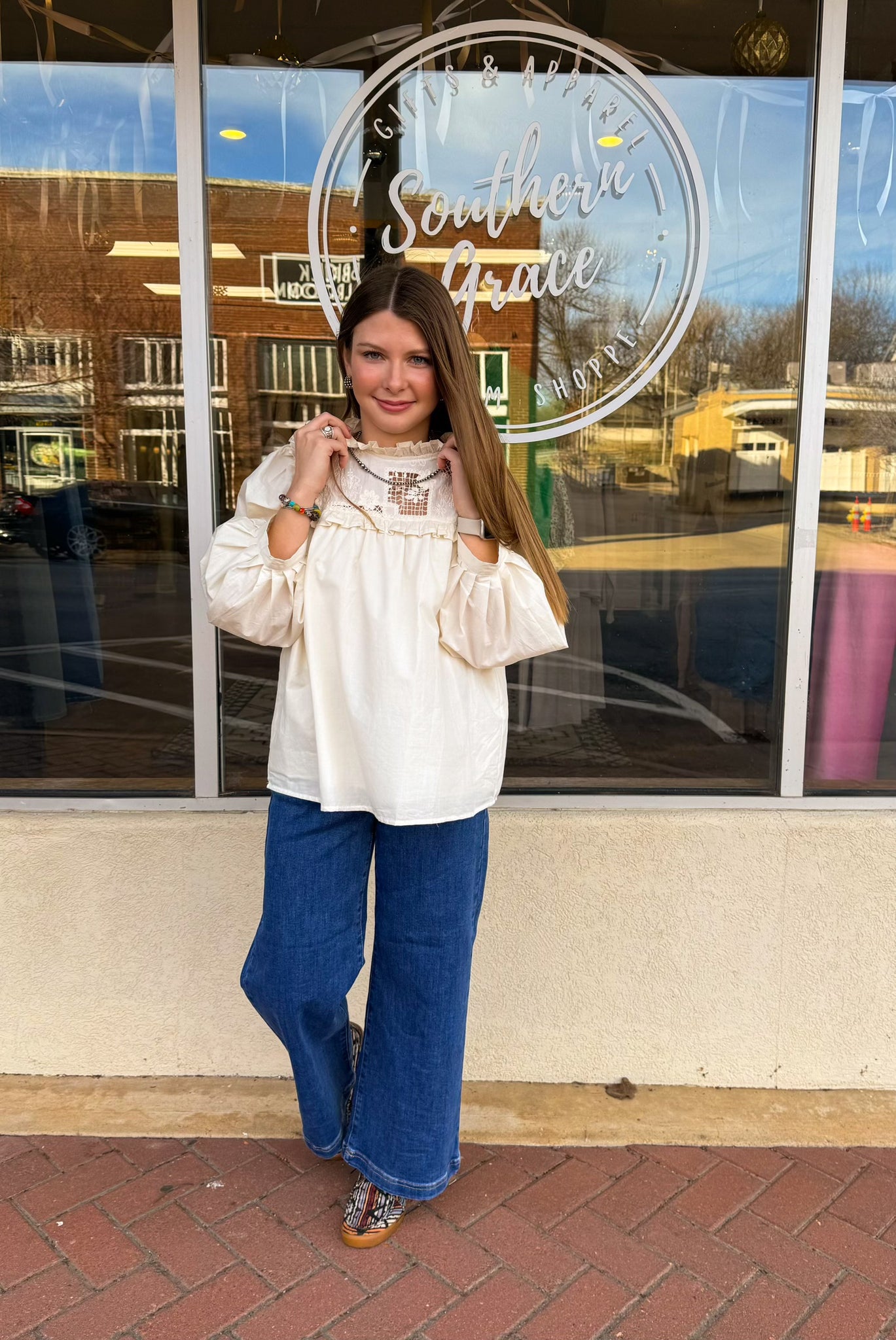 The Raleigh Blouse features elegant lace, subtle feminine ruffles, and a flowing silhouette.