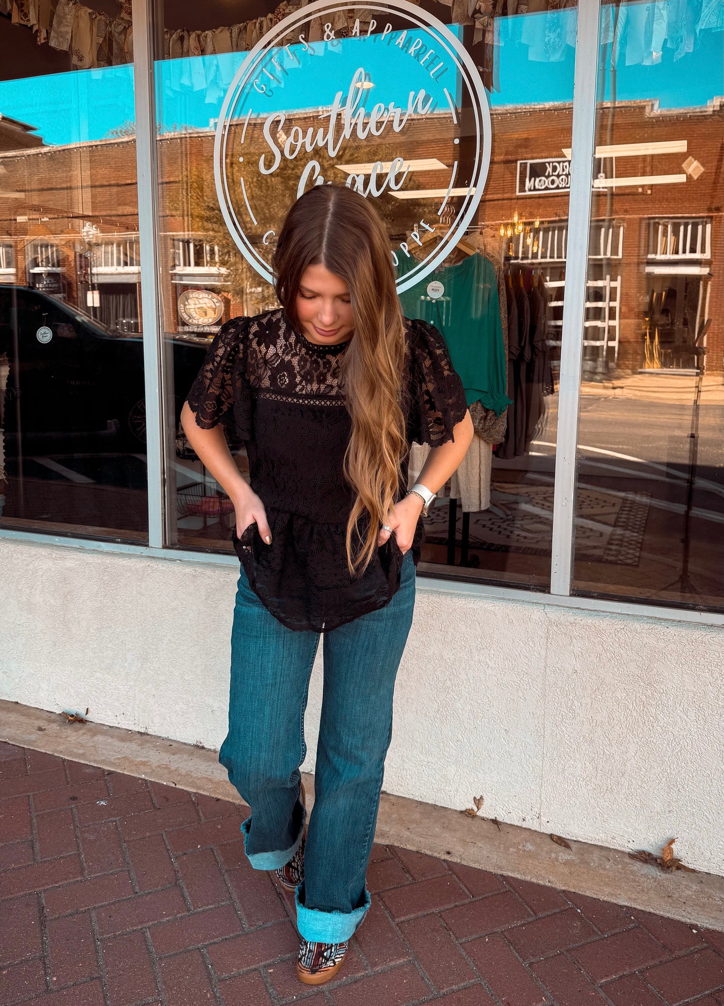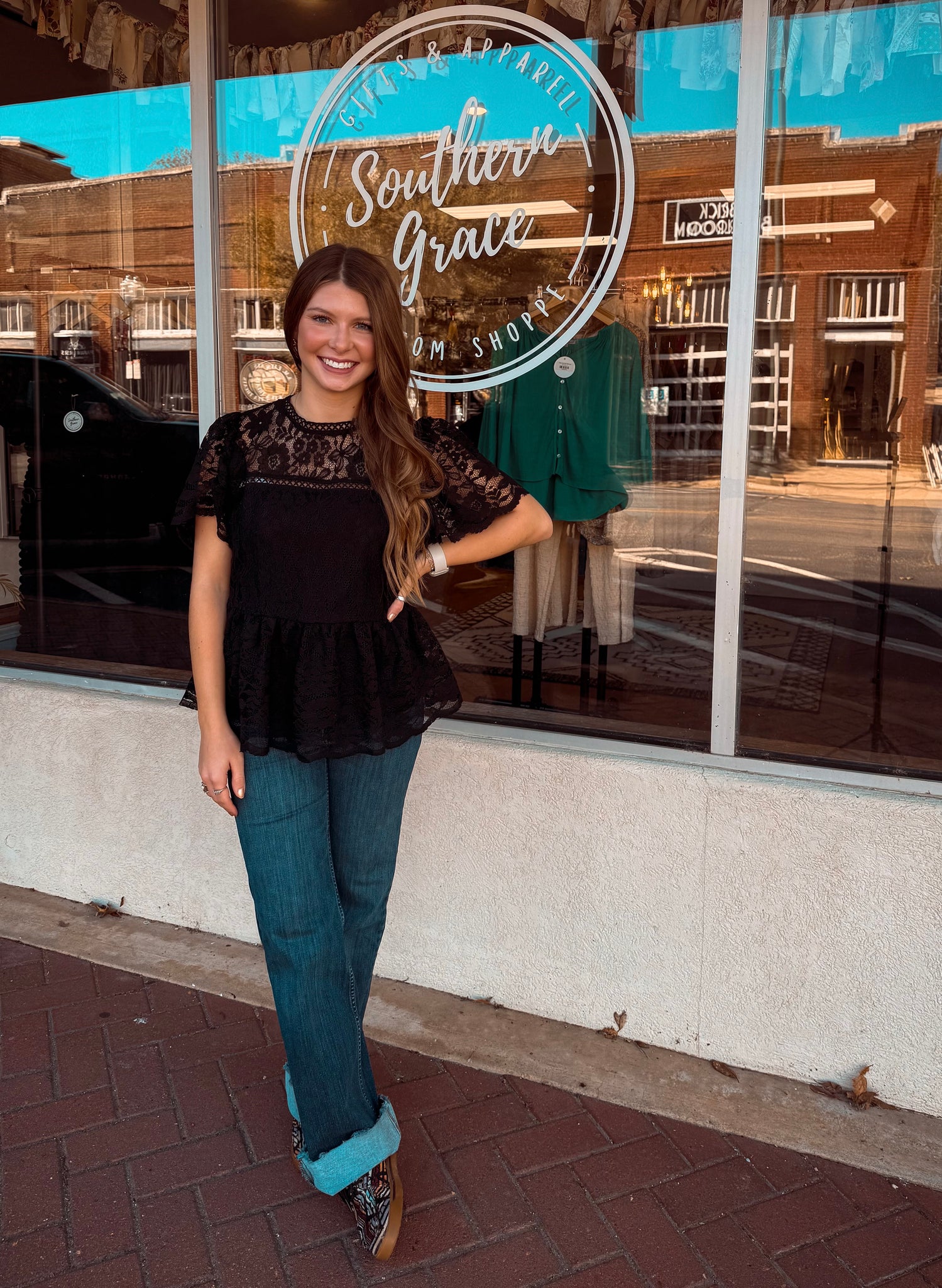 The Lovely Lace Blouse features stunning detail, intricate lace, and a super soft lining.