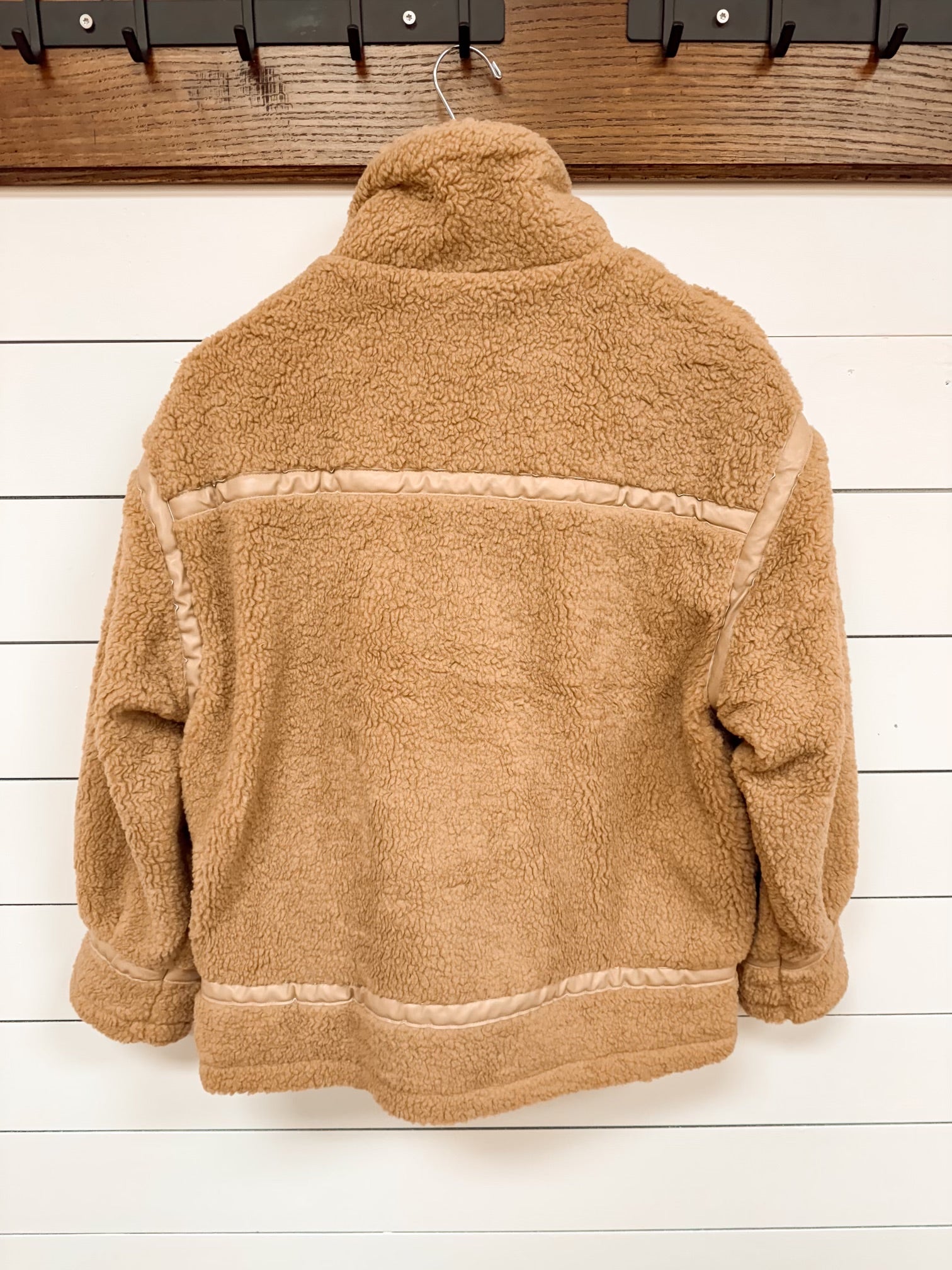 Featuring a plush teddy texture, structured button-up front, and elevated faux leather trim, this outerwear style is both functional and fashionable. The side pockets add extra practicality while the warm brown hue makes it an easy neutral for layering.